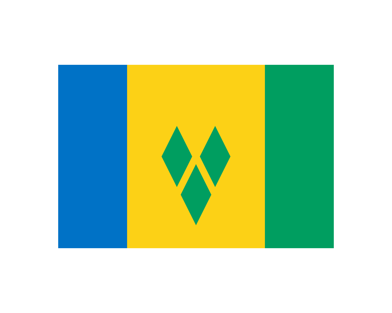 圣文森特和格林納丁斯(Saint Vincent and the Grenadines),由圣文森特島以及格林納丁斯群島組成,是位于東加勒比海小安的列斯群島南部的一個火山島國,首都金斯頓。圣文森特和格林納丁斯國旗啟用于1985年10月21日,國旗呈長方形,長寬比為3:2。旗面自左至右由藍、黃、綠三個豎長方形構(gòu)成,黃色長方形中有三個綠色的菱形圖案。藍色象征海洋,綠色象征大地,黃色象征陽光。