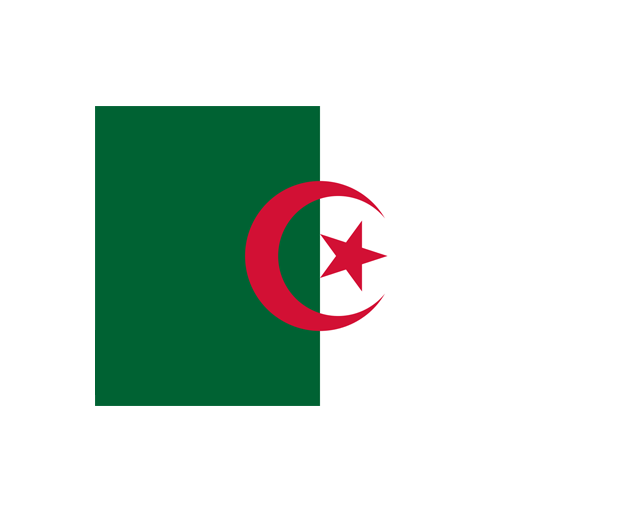 阿爾及利亞,全稱阿爾及利亞民主人民共和國,是非洲北部馬格里布的一個國家,首都是阿爾及爾。阿爾及利亞民主人民共和國國旗呈長方形,長與寬之比為3∶2。旗面由左綠右白兩個平行相等的豎長方形組成,中央為一彎紅色新月和一顆稍微傾斜的紅色五角星。綠色象征未來的希望,白色代表純潔與和平,紅色象征革命和為理想而奮斗的獻身精神。阿爾及利亞以伊斯蘭教為國教,新月和五角星是這個穆斯林國家的象征。