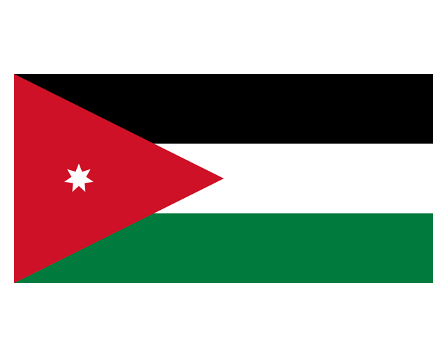 約旦哈希姆王國(The Hashemite Kingdom of Jordan),簡稱約旦(Jordan),位于亞洲西部,約旦國旗呈長方形,長與寬之比為2∶1。靠旗桿一側為紅色等腰三角形,內有一顆白色七角星;右側自上而下為黑、白、綠三色的平行寬條。以上四種顏色為泛阿拉伯色,白色七角星象征古蘭經。約旦國旗和巴勒斯坦國旗很相似,唯一不同是約旦國旗在紅色三角形上多一個白色七角星。