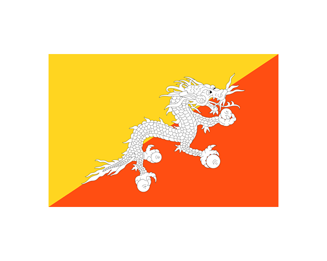 不丹王國(藏語拼音:Zhugyü),簡稱“不丹”,位于中國和印度之間喜馬拉雅山脈東段南坡,不丹的首都是廷布,國歌為《神龍王國》,不丹國旗是一種龍旗,呈長方形,長與寬之比為3∶2。由金黃色和桔紅色的兩個直角三角形組成,中間一條白色的飛龍,四個爪子各抓一顆白而亮的寶珠。金黃色象征國王的權力和作用;桔紅色是僧侶長袍的顏色,象征佛教的精神力量;龍象征國家權力,又指這個國家的名字,因為不丹可譯為“神龍之國”。龍爪上握有白珠,象征威力和圣潔。