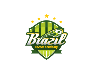 Brazil Soccer Academy巴西足球學校標志設計,融入足球場和足球元素,以綠色和黃色作為主識別色。