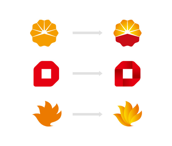 第一個是昆侖潤滑油的logo,經過漸變的美化,體現出了太陽與能源的象征;而第二個logo東莞農村商業銀行在沒有經過漸變美化之前簡直不能夠去看,你會 發現很丑,經過美化,幾何化的色彩建筑效果立刻體現,讓人感到強烈的立體感與空間感;第三個幸福航空的logo則更是將漸變發揮到最完美,變為了好看的翅 膀與花瓣。