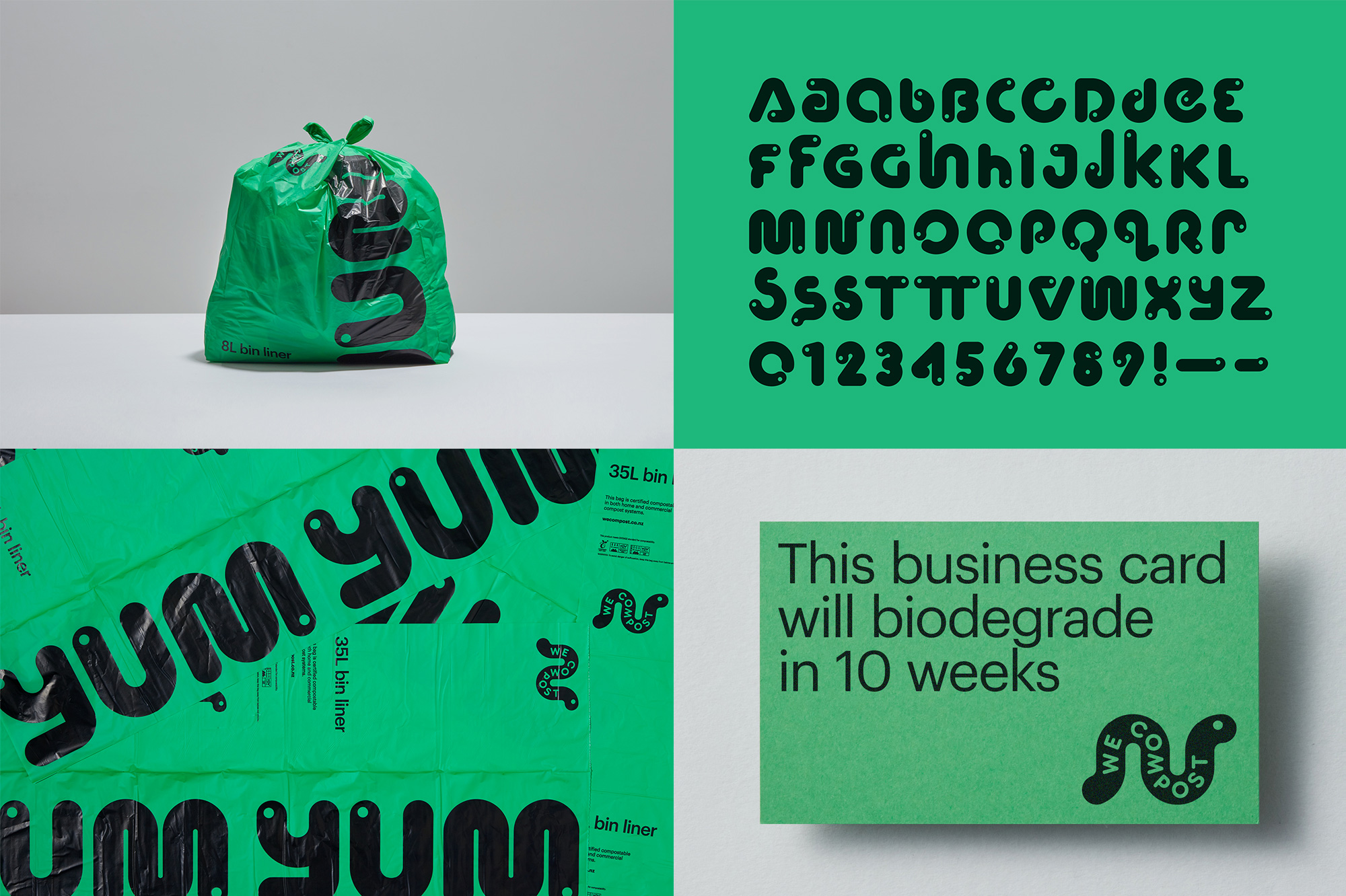 We Compost是超級(jí)垃圾提供的服務(wù)之一,是新西蘭奧克蘭的領(lǐng)先的商業(yè)堆肥收集服務(wù),自2012年以來(lái)從垃圾填埋場(chǎng)轉(zhuǎn)移了超過(guò)1300萬(wàn)磅(600萬(wàn)公斤)的堆肥。同樣由Seachange設(shè)計(jì)的《身份》,以一只可愛(ài)的蠕蟲(chóng)為主角——如果你曾經(jīng)堆肥過(guò),那么你一定也經(jīng)歷過(guò)這些蠕蟲(chóng)——用最少的、好玩的、大眼睛的圖畫(huà)和版式笨拙而迷人地貫穿其身體。一個(gè)由蠕蟲(chóng)組成的擴(kuò)展字母表絕對(duì)是愚蠢的,但卻非常棒,而且出乎意料的有用和可讀。這是一個(gè)很好的例子,巧妙地打破行業(yè)標(biāo)準(zhǔn)和期望,脫穎而出。