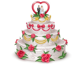 豪華婚禮蛋糕寫實圖標設計,融入婚禮、玫瑰、葉子、彩簾等元素。