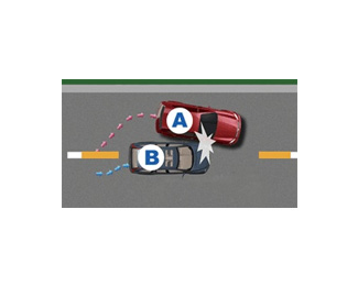 發(fā)生如上圖的越線超車事故責任認定時,A車全責,中心黃色雙實線表示嚴格禁止車輛跨線超車或壓線行駛,一旦車輛因超車越線發(fā)生事故就要負責全部責任。黃色虛線可以并線,調(diào)換車道,但一旦因超車越線發(fā)生事故就將負全部責任。