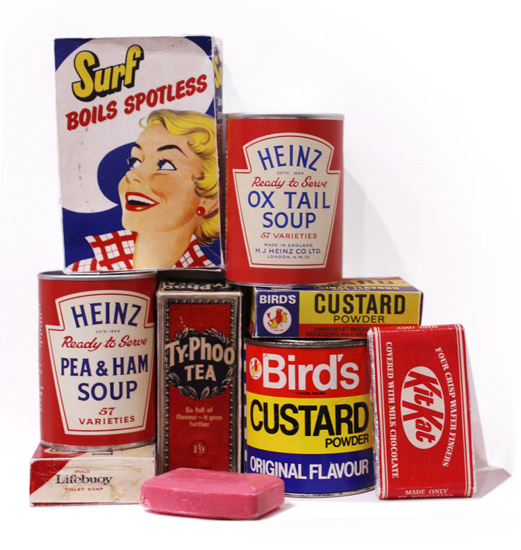 這些包裝的內(nèi)容各不相同,但它們可能包括20世紀(jì)60年代的傷寒茶包復(fù)制品、食品部在配給和戰(zhàn)時(shí)發(fā)放的蛋干罐頭、20世紀(jì)50年代設(shè)計(jì)的Kit Kat包裝和20世紀(jì)60年代設(shè)計(jì)的Lifebouy石碳酸皂。