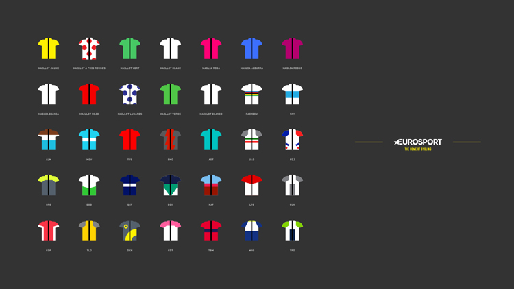 其他圖形元素包括地圖和賽道信息圖形,以演示比賽和山地等級,以及騎手的個(gè)人資料,顯示他們的臉,團(tuán)隊(duì)和比賽號碼,以及相關(guān)的事實(shí)和數(shù)字。